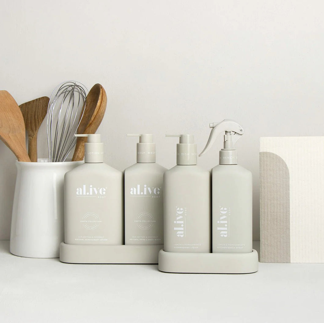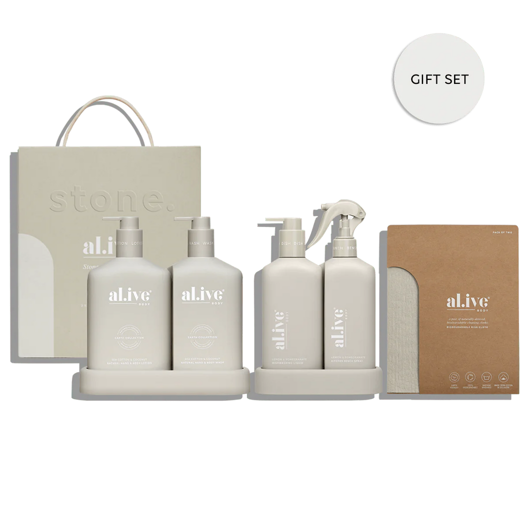 This gift set includes three incredible products: the Sea Cotton & Coconut Wash & Lotion Duo, Bench Spray & Dishwashing Liquid Kitchen Duo, and the Biodegradable Dish Cloth Pack of 2.