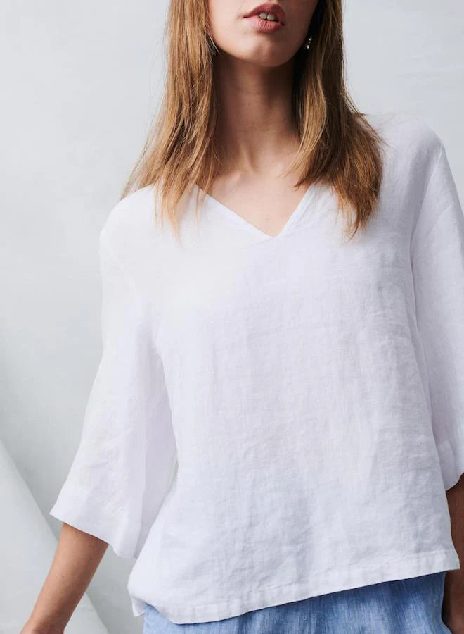 Our newest linen top, the Little Lies Andrea in Natural is the perfect trans-seasonal top that can be dressed up or worn casually which makes it suitable for all occasions. In 100% Linen, it has a relaxed, classic fit with 3/4 sleeves and a flattering V Neck. It’s the simplicity of the shape that makes it a stunning piece that can be worn by anyone.