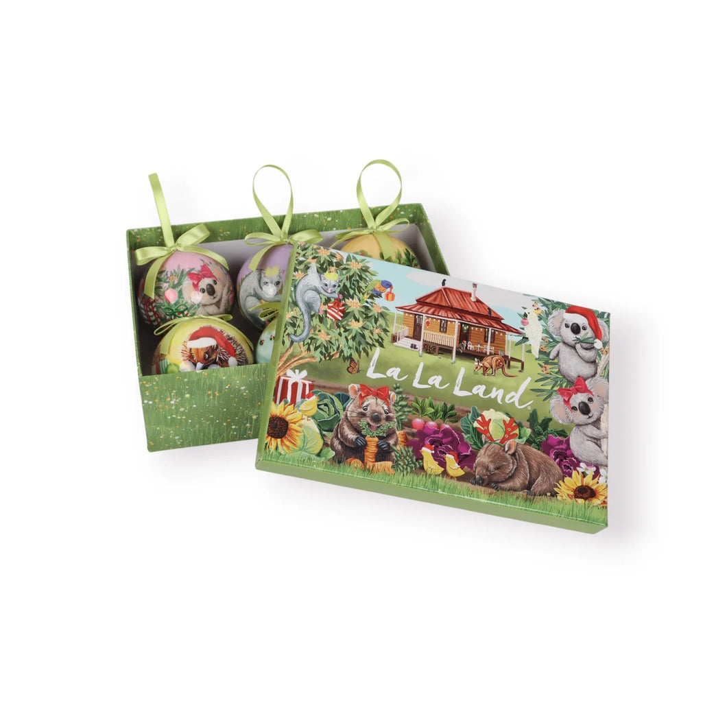 Introducing our Garden Giggles Bauble Set by La La Land artist, Laura Ramos. Elevate your holiday decor with our Bauble Set, featuring 6 unique illustrated baubles, each a masterpiece showcasing the whimsical illustrations from our Garden Giggles collection. Lightweight and captivating, these baubles come in a charming gift box for easy storage. Embrace the spirit of Australian rural living and make your holidays truly meaningful with the Garden Giggles bauble set!