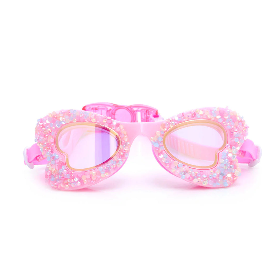 Spread your wings and fly like the wind in Blushing Butterfly Swim Goggles. This butterfly shaped swim goggle features a frame full of shaved rhinestones and a back clip for easy application.