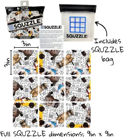 Discover Squzzle Puzzles – a captivating 9-piece brain teasing square puzzle that will have your mind in circles! Arrange and rearrange the pieces into a 3x3 grid so each interior image has a match with its opposite half. Twist and turn your way through this mesmerizing square puzzle that will have your mind spinning!